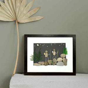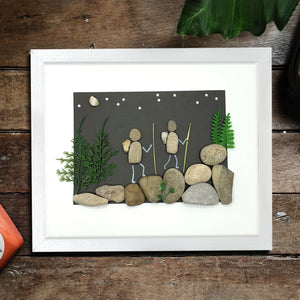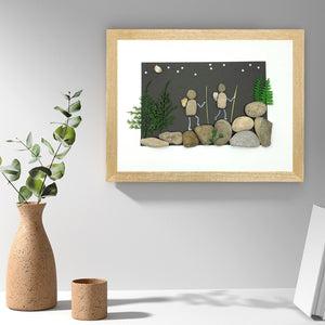 Celebrate your dad’s transition into retirement with our Adventure Awaits Keepsake Frame. This unique artwork captures the spirit of exploration and the joy of new beginnings, featuring two hikers crafted from natural stones against a striking dark background. The playful design is complemented by vibrant greenery and a starry sky, symbolizing the endless possibilities that lie ahead.
