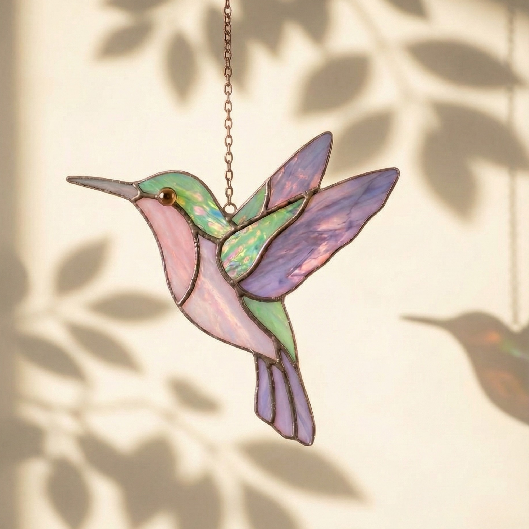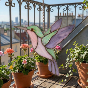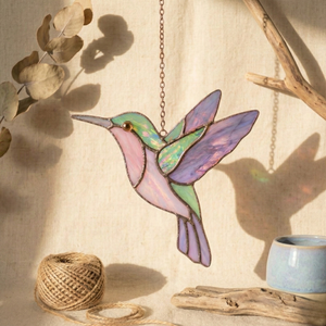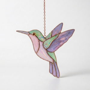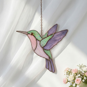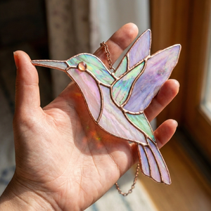 This hummingbird stained glass suncatcher captures the elegance of a bird in mid-flight, glowing gently as sunlight passes through its pastel colors. Hung by a window, it creates a peaceful and artistic atmosphere that feels light, airy, and timeless.