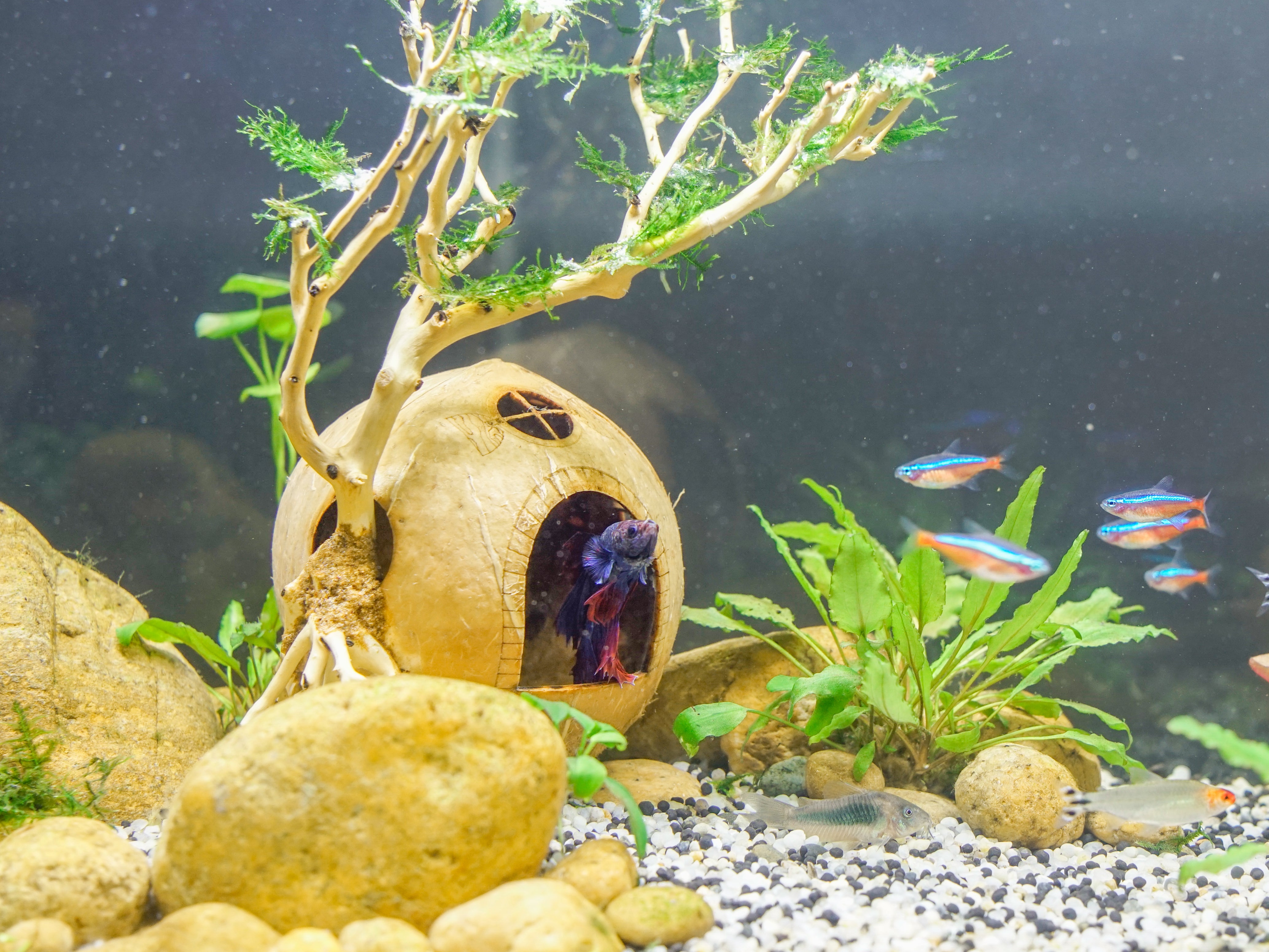 Home Coconut Shell Cave With Driftwood Bonsai Aquarium Cave, Fish Hide Cave, Cichlid Cave, Betta Fish Cave, Shrimp Cave, Cloves Cave, Aquarium Decoration