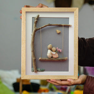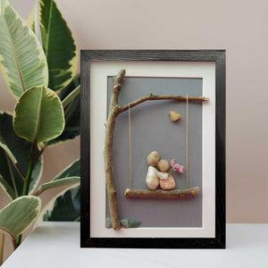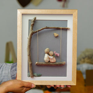 Embrace the sweetness of love with our Couple on a Swing Art Frame. This delightful piece features a charming scene of a couple nestled together on a swing, crafted from natural stones and twigs. The tender moment is beautifully complemented by a delicate flower, symbolizing affection and romance.