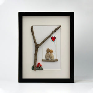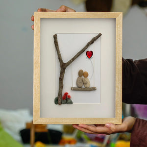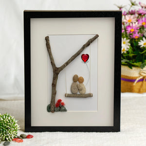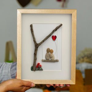 Capture the essence of love with our charming Couple on a Swing Keepsake Frame. This beautifully crafted artwork features a couple sitting closely on a swing, made from natural stones and twigs, symbolizing togetherness and affection. The vibrant red heart balloon adds a playful touch, making this piece a perfect representation of love's joy.