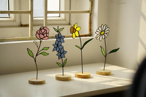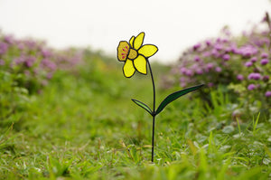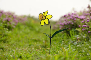 Bring a ray of sunshine and natural charm into your space with our exquisite handcrafted daffodil suncatcher. Celebrating the joyful March birth flower, this radiant sun catcher features bright yellow petals and a vibrant center, meticulously crafted from individual pieces of beautiful stained glass. Each piece is thoughtfully assembled using traditional copper foil and lead solder techniques, creating a unique daffodil stained glass design. Standing approximately 25 cm (9.84 inches) tall, this elegant stained glass plant includes a high-quality wooden base, making it perfect for displaying in sun-filled windows, on shelves, or as a delightful accent in any room.