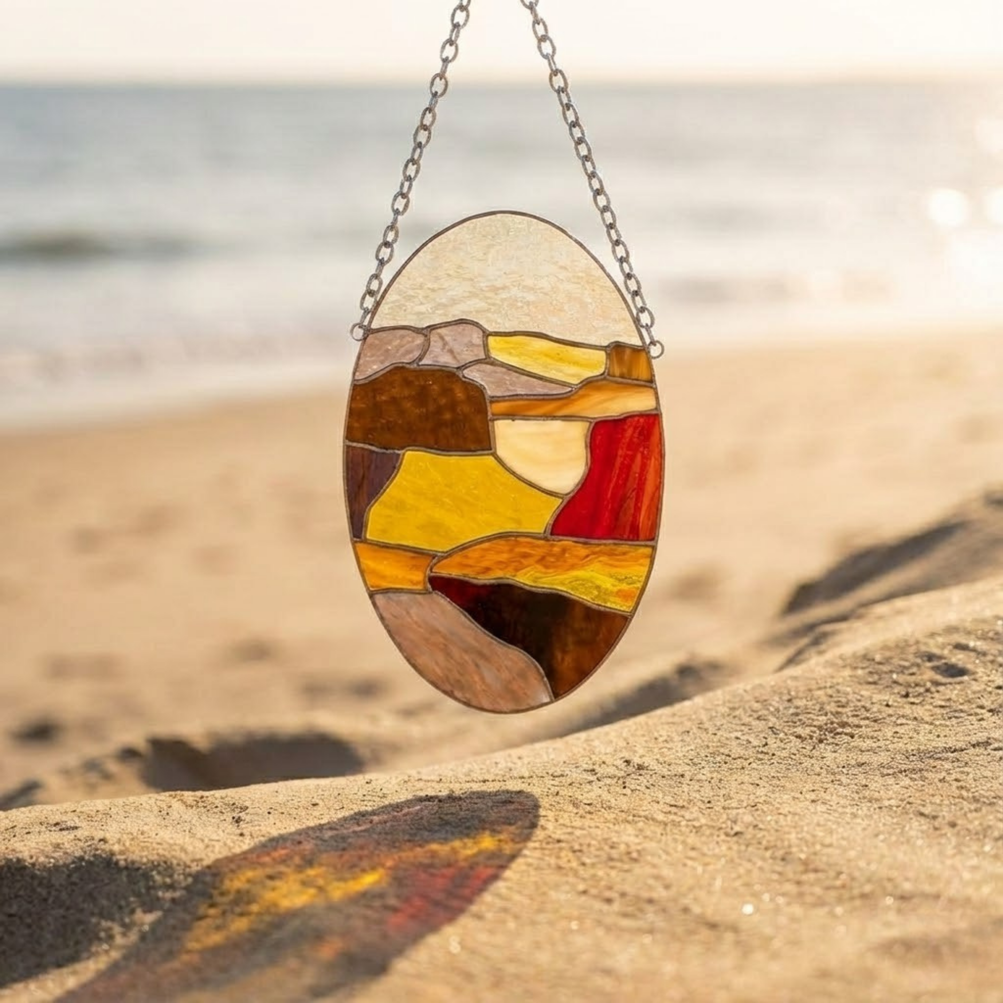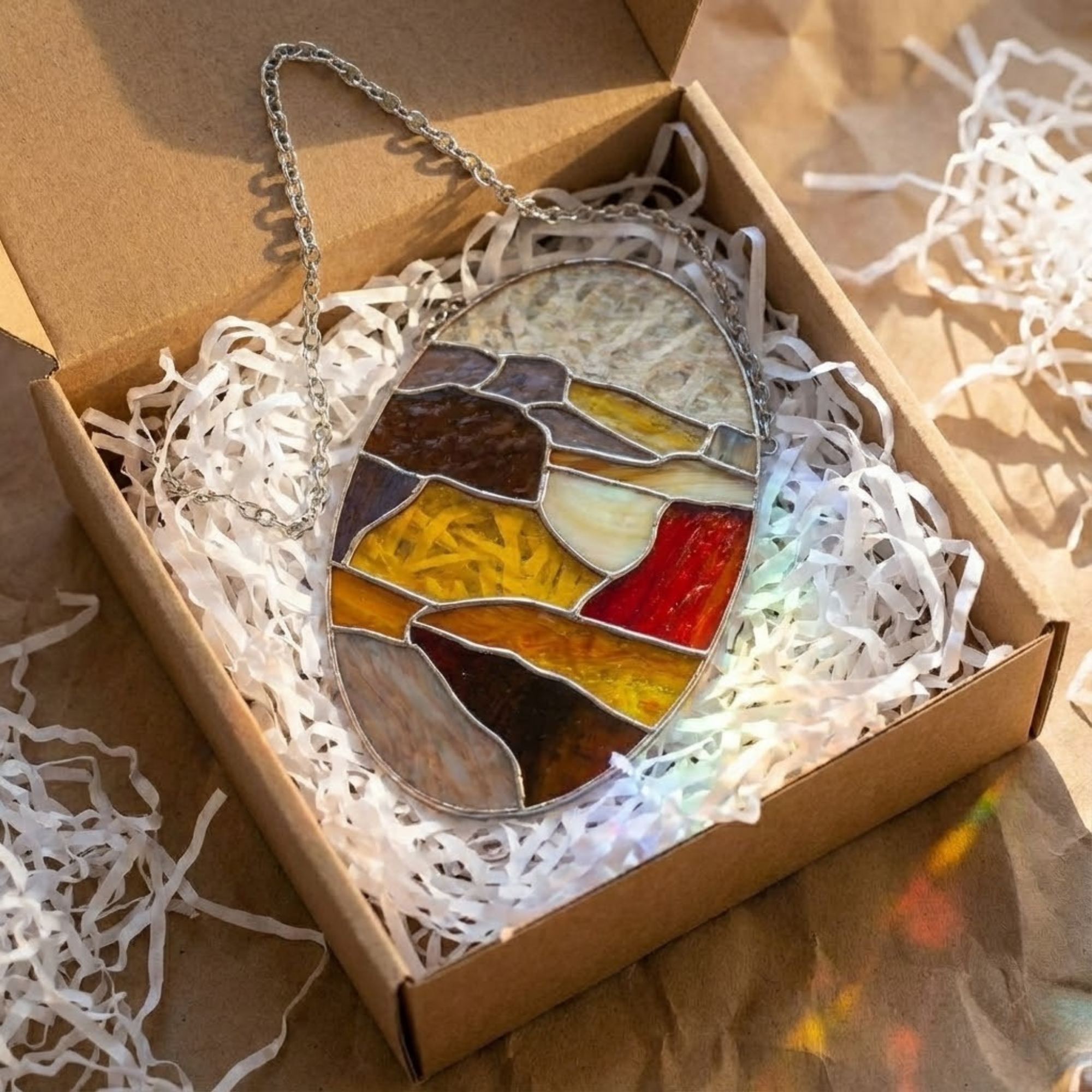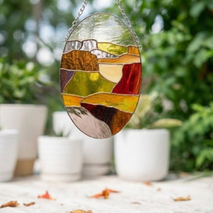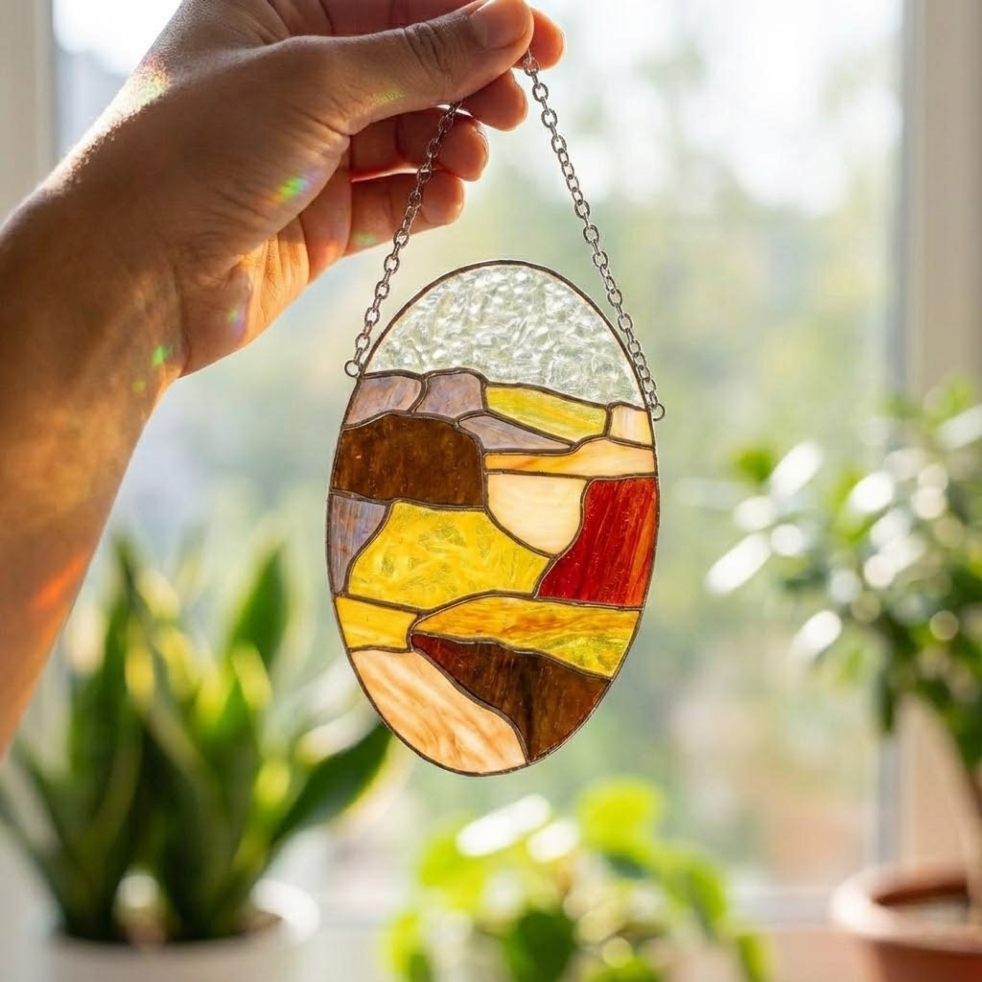 Inspired by the rolling hills of the countryside and the layered beauty of sedimentary rock canyons, this design is a tribute to the grounding power of nature. The abstract layers of color represent the different chapters of life—distinct yet flowing together beautifully. It is more than just decor; it is a symbol of stability, growth, and the quiet beauty found in the natural world. Hanging this in your window serves as a daily reminder to breathe deeply and appreciate the view.