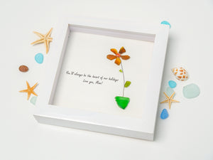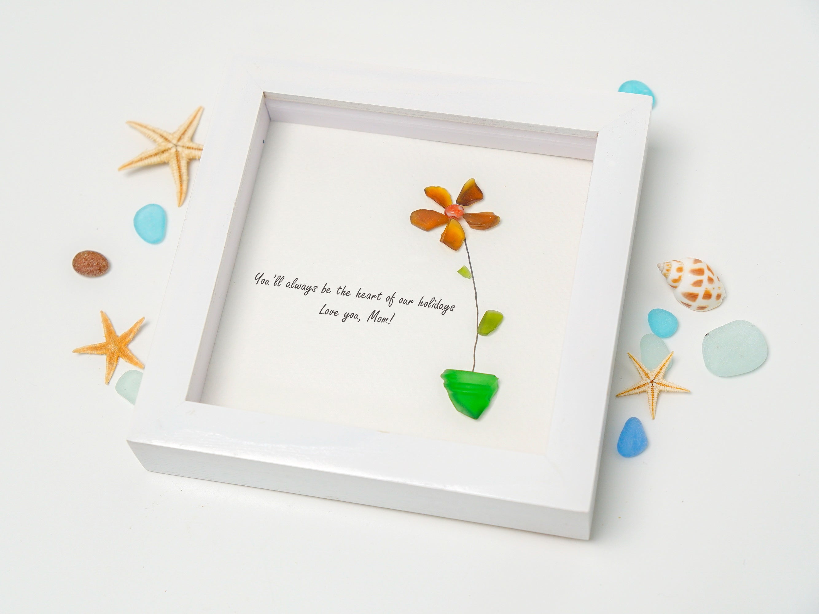 Express your love and gratitude with this elegant sea glass art piece. Featuring a delicate flower made from beautifully arranged sea glass, this handcrafted design brings a touch of nature indoors. The vibrant green and orange hues of the glass petals and leaves create a striking contrast against the minimalist white background, all encased in a chic black frame. The heartfelt inscription reads, "You’ll always be the heart of our holidays. Love you, Mom!" making this a perfect gift for Mother's Day, Christmas, or any special occasion. This unique piece of art is a lovely reminder of the enduring love between mother and child, ready to brighten up any space.