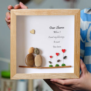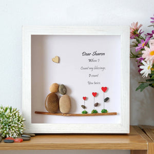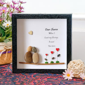 Celebrate your sister with this beautiful and sentimental gift! This charming frame features the touching message: "Dear Sharon, When I count my blessings, I count you twice." Accompanied by delightful stone figures and heart-themed accents, it captures the essence of your special bond. Perfect for her birthday, this piece serves as a lovely reminder of how much she means to you. It’s an ideal addition to her room, adding a personal touch that she will cherish forever. Gift her this heartfelt keepsake to show your love and appreciation on her special day!