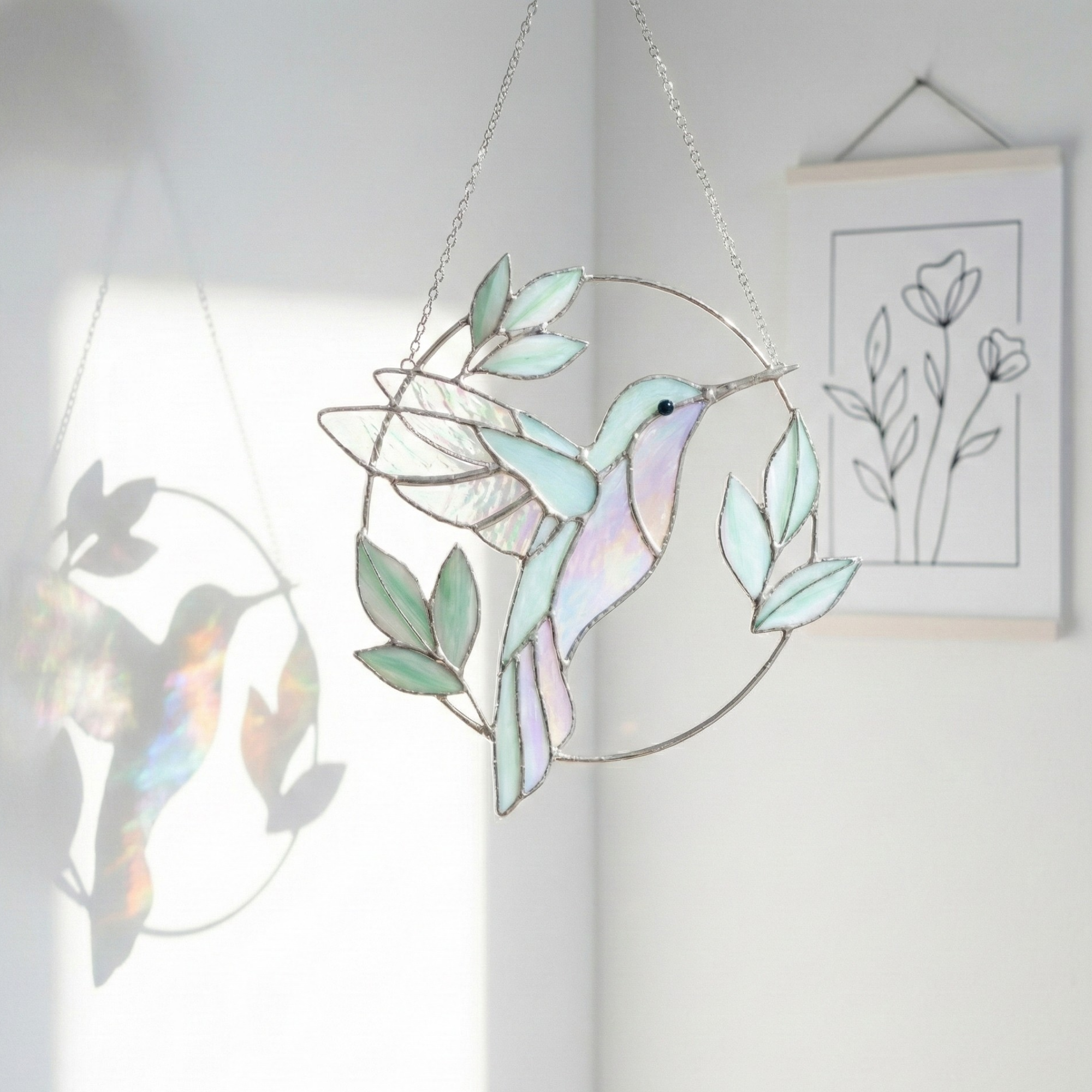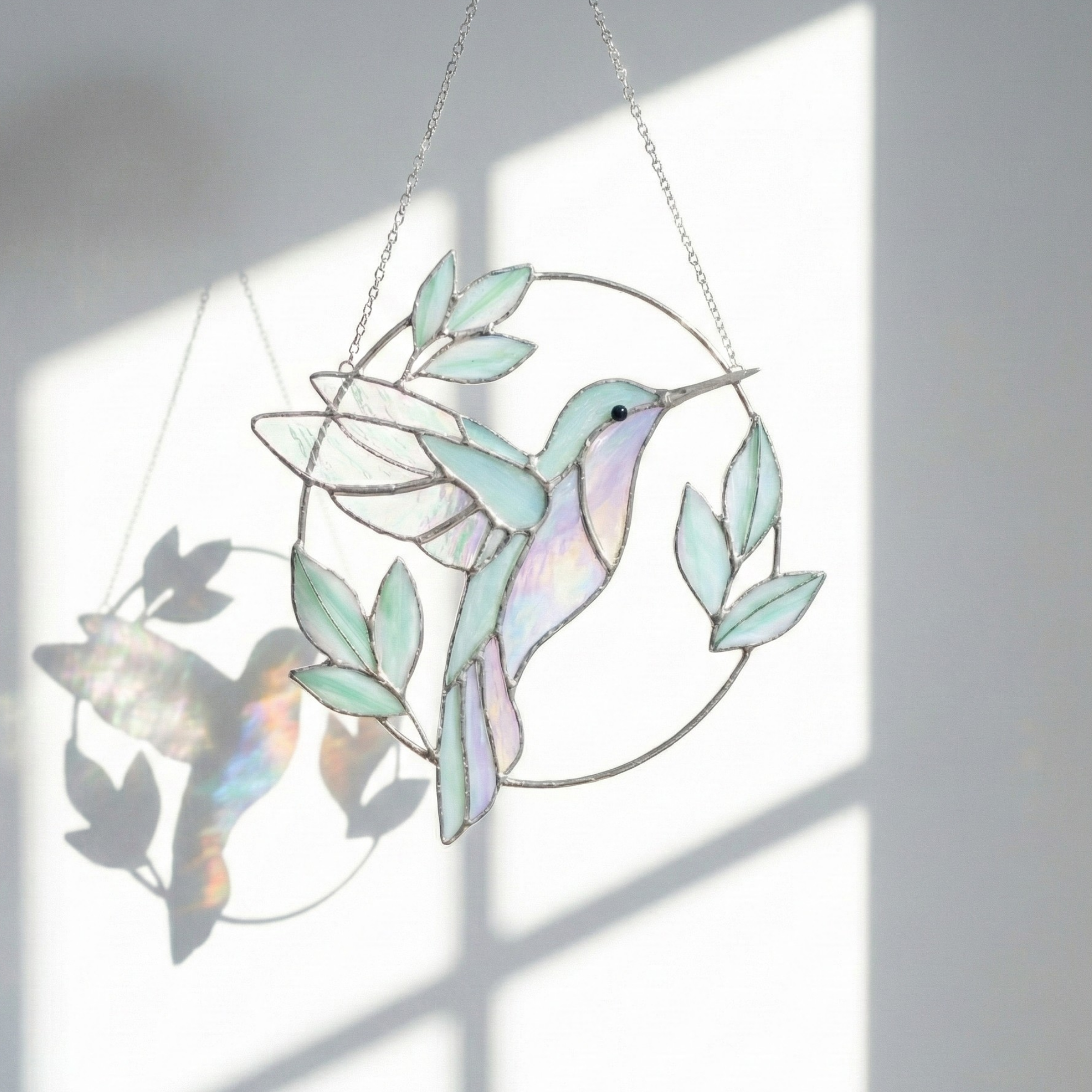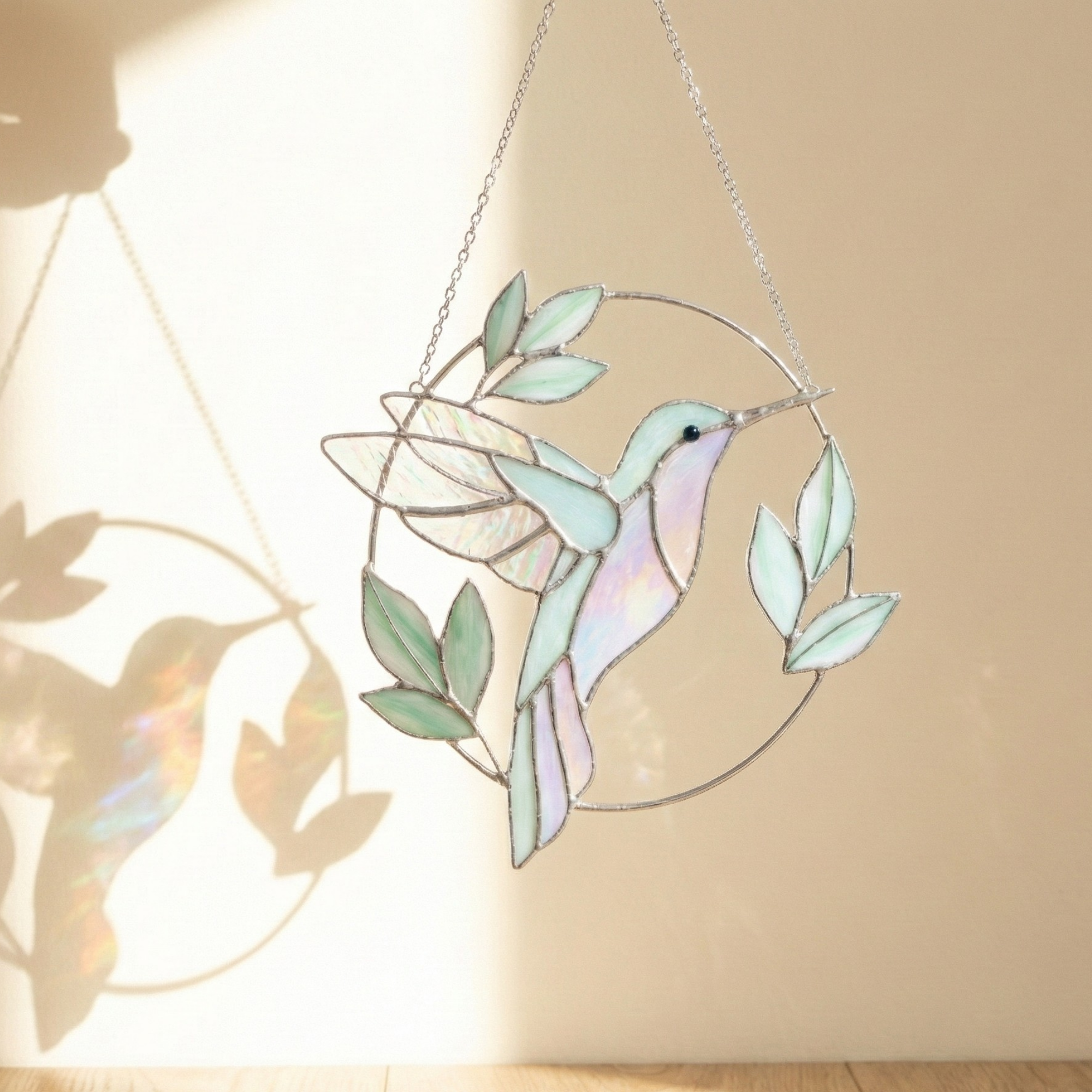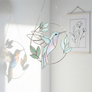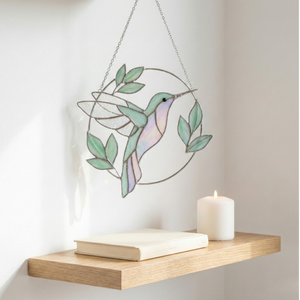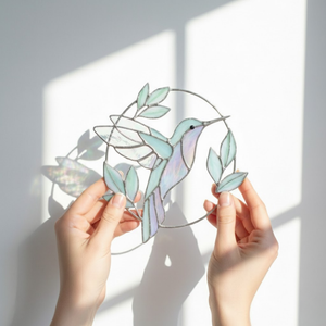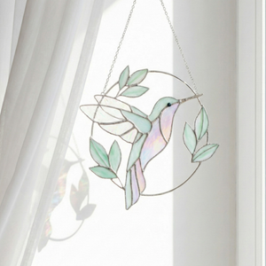 Thisiridescent stained glass hummingbirdis suspended mid-flight, framed by soft leaves and gentle curves that echo the quiet rhythm of nature. As sunlight passes through the glass, subtle rainbow tones shimmer across its surface, shifting beautifully throughout the day.