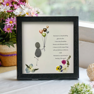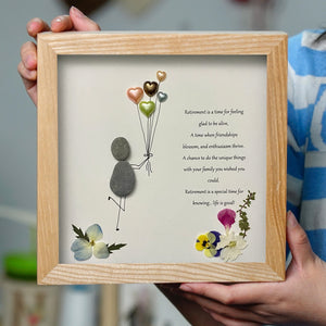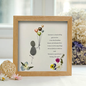 Celebrate the exciting new chapter of retirement with our Joyful Journey Keepsake Frame. This charming artwork features a whimsical figure holding colorful heart-shaped balloons, beautifully crafted from natural stones and delicate floral accents. Accompanying the delightful imagery is an inspiring poem that captures the essence of retirement: a time for enjoyment, friendships, and the pursuit of cherished dreams.