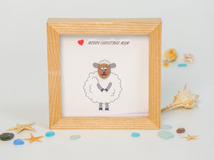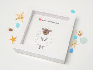 This charming card features a cartoon sheep design with the heartfelt message "MERRY CHRISTMAS MUM" written above it. The card, held delicately in a hand, serves as a festive and thoughtful ornament to celebrate the holiday season with your beloved mother.