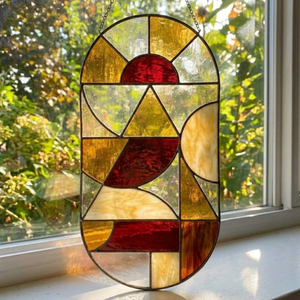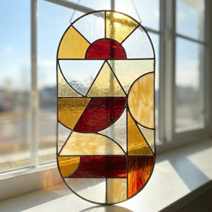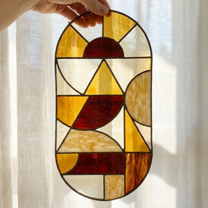 Inspired by mid-century modern design and the hues of a setting sun, this abstract design balances bold geometry with organic warmth. The deep burgundy red represents grounding energy, while the translucent amber and textured creams invite optimism and joy. It serves as a beautiful reminder to find harmony in your day, making it a meaningful addition to your meditation corner, living room, or home office.