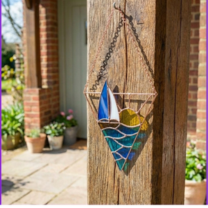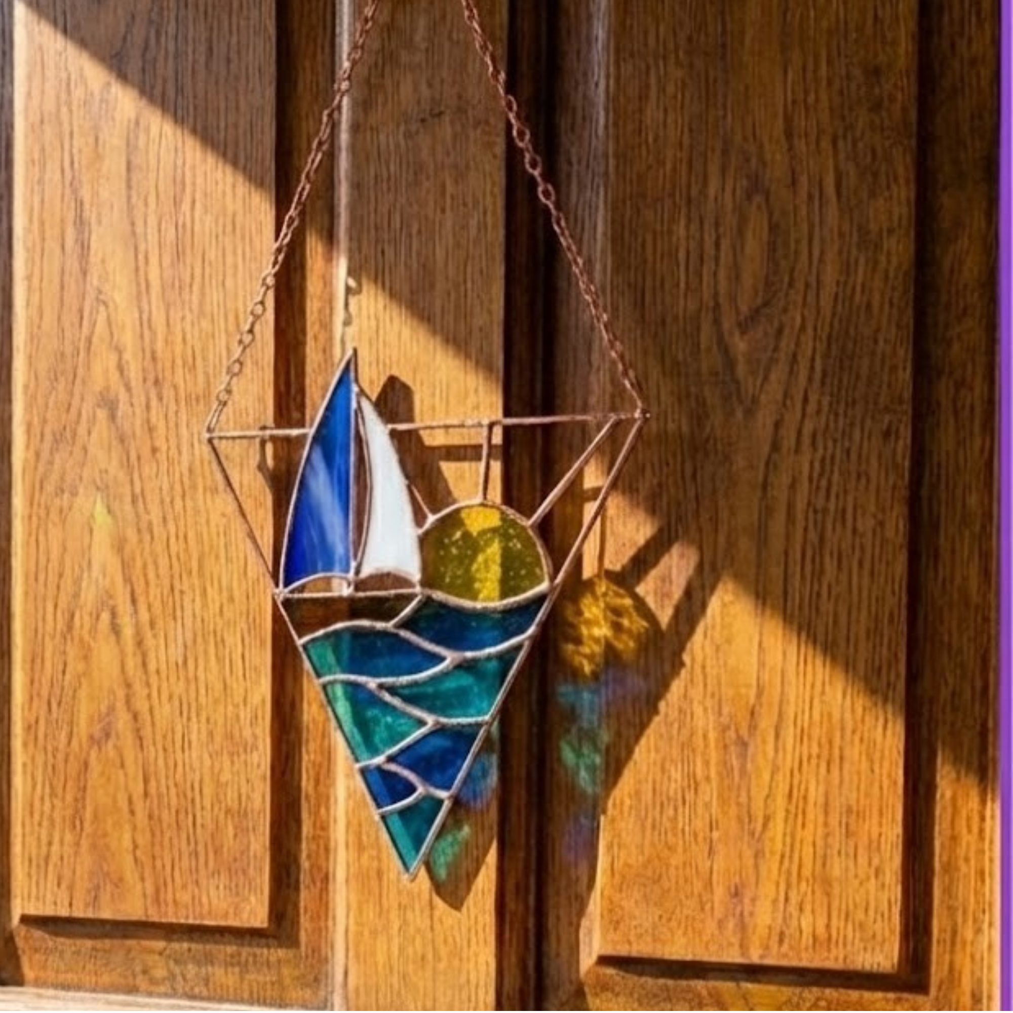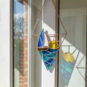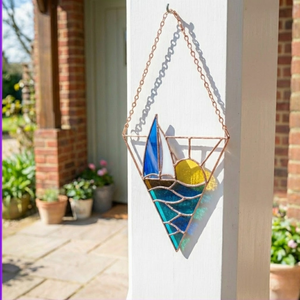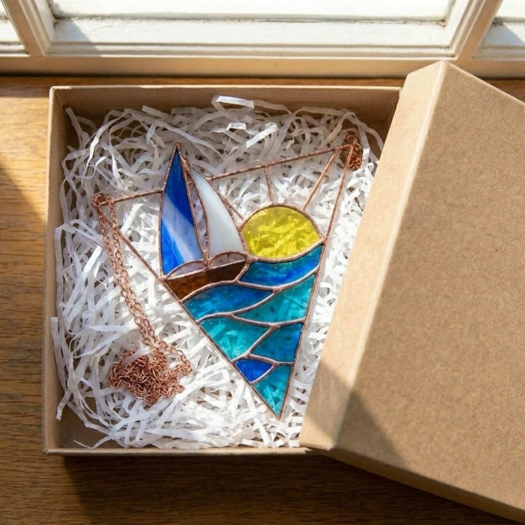Each segment—from the white sail to the rolling blue waves—is hand-cut, ground, and wrapped in copper foil.