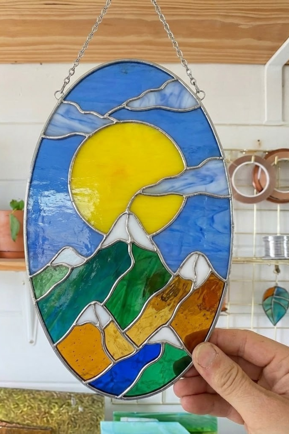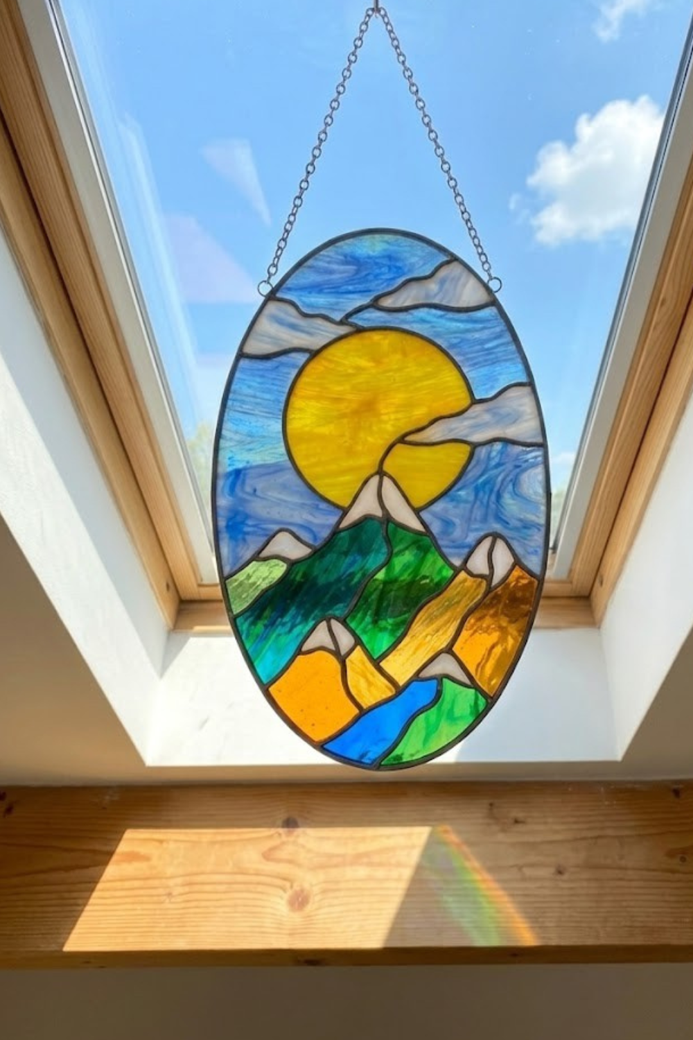 Bring the Outdoors In 🏔️✨ Imagine catching a glimpse of a radiant sunrise over serene peaks every time you look at your window. This piece captures the pure magic of morning light hitting the mountains. As the sun shines through the vibrant yellow and cool blue glass, it casts a warm, uplifting glow into your space, instantly creating an atmosphere of calm and wanderlust. It’s not just decor; it’s a breath of fresh mountain air for your home.