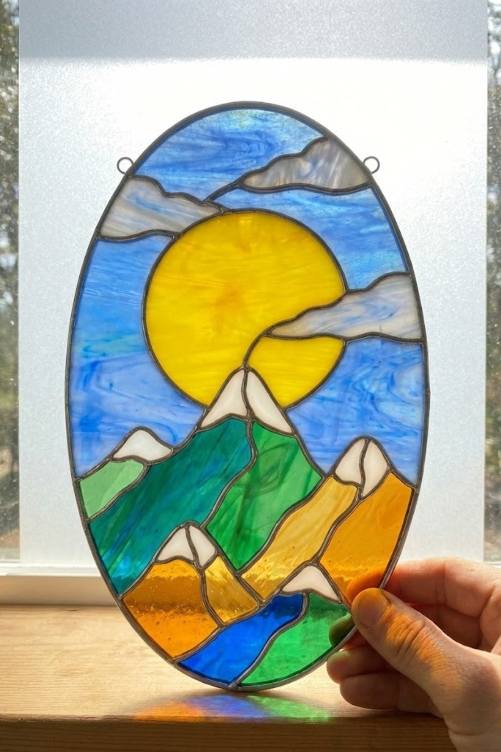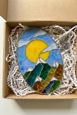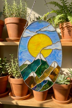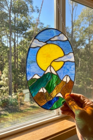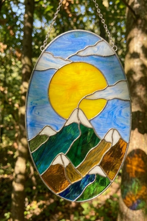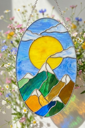 The Story of the Peaks 🌄 Inspired by the majestic beauty of the great outdoors, this artwork depicts a golden sun rising above lush green and snow-capped mountains. The mountain symbolizes strength, adventure, and the journey of life, while the bright sun represents hope and new beginnings. Whether you are an avid hiker or simply someone who finds peace in nature, this stained glass panel serves as a gentle reminder of the beauty that awaits outside.