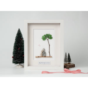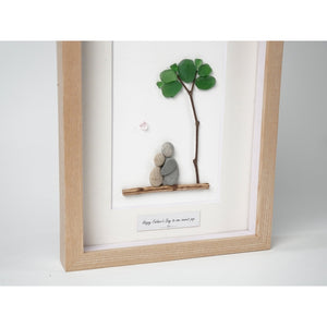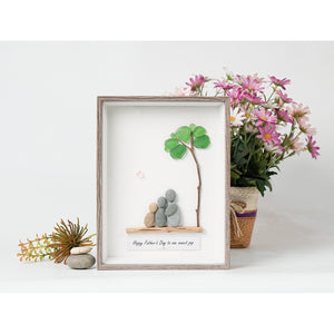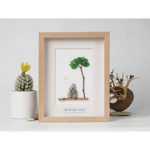 Celebrate your dad's special day with this beautifully crafted pebble art picture frame. Featuring two pebble figures sitting under a tree with green leaves, the art symbolizes love and connection. The heartfelt message "Happy Father's Day to one sweet pop" is thoughtfully placed below the scene, making it a perfect keepsake to show your appreciation. Encased in an elegant black frame, this handmade piece is ready to be displayed as a touching reminder of your love for your dad. Ideal for father's day or any special occasion.