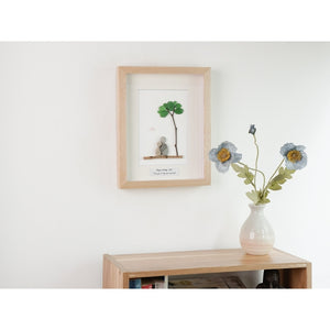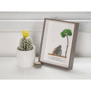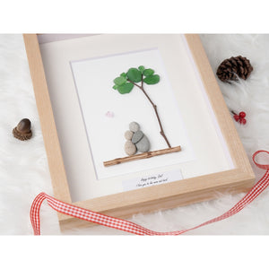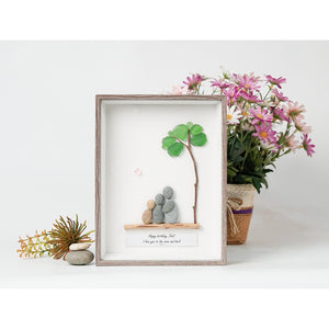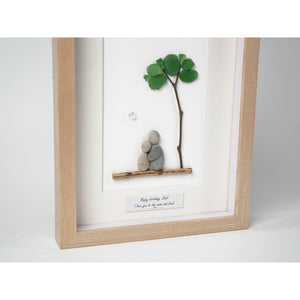Celebrate your dad's special day with this beautifully crafted pebble art picture frame. Featuring two pebble figures sitting under a tree with green leaves, the art symbolizes love and connection. The heartfelt message "Happy birthday, Dad! I love you to the moon and back" is thoughtfully placed below the scene, making it a perfect keepsake to show your appreciation. Encased in an elegant frame, this handmade piece is ready to be displayed as a touching reminder of your love for your dad. Ideal for birthdays or any special occasion.