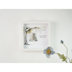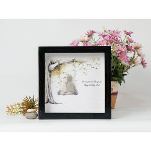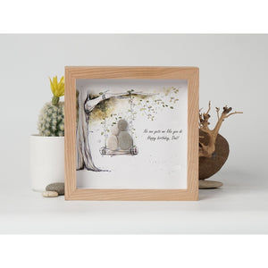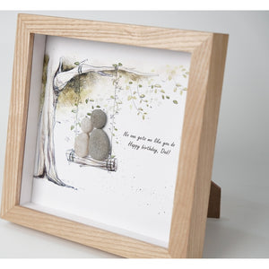 This unique pebble art picture frame is a heartfelt gift for Dad's birthday. The artwork features two pebble figures sitting on a swing under a beautifully illustrated tree branch. The words "No one gets me like you do. Happy birthday, Dad!" are inscribed, making it a perfect reminder of your special bond. Encased in a sleek frame, this piece is ready to be displayed and cherished for years to come. Ideal for any dad who appreciates thoughtful, handmade gifts.