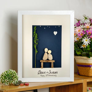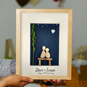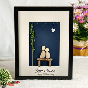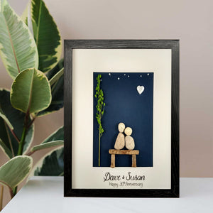 Celebrate 30 wonderful years together with our 30th Anniversary Keepsake Frame dedicated to mom and dad. This charming artwork features a beautifully crafted scene of a couple sitting on a bench, made from natural stones, against a striking navy blue background. Delicate greenery adds a touch of nature, while a soft heart and twinkling stars complete the romantic ambiance.