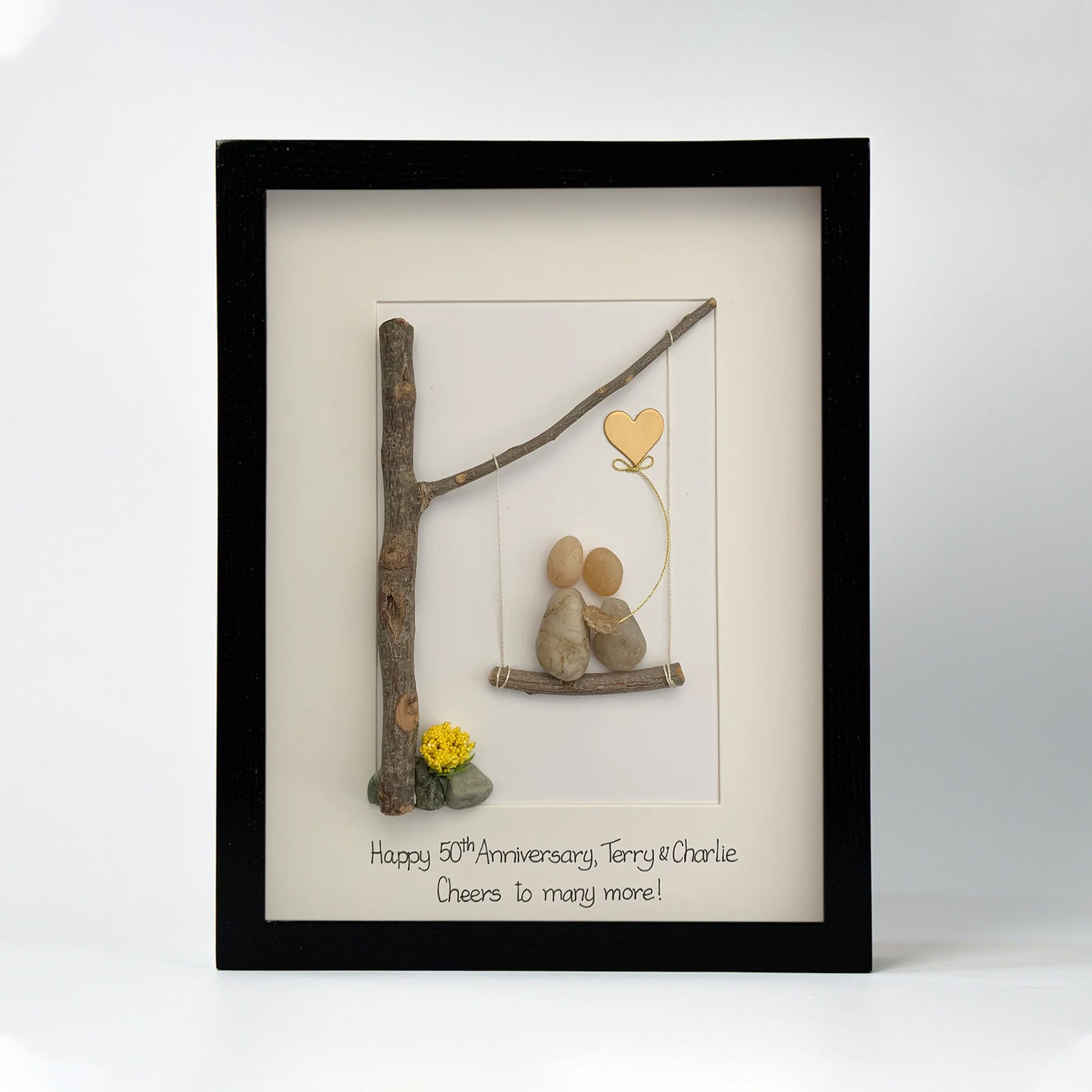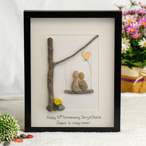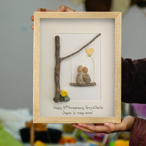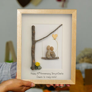 Celebrate a remarkable 50 years of love with our 50th Anniversary Keepsake Frame. This charming piece features a delightful scene of a couple sitting on a swing, made from natural stones and twigs, symbolizing the joy and connection of mom and dad. The whimsical golden heart balloon adds a playful touch, making it a perfect tribute to their enduring relationship.