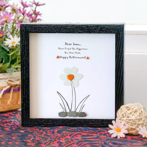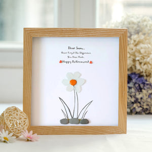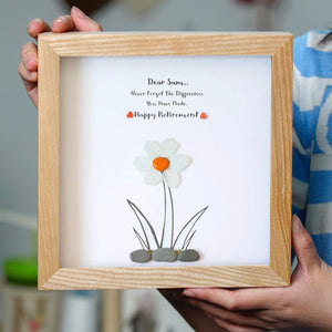 Celebrate a remarkable journey with our Cherished Memories Keepsake Frame, a heartfelt retirement gift designed to honor the impact of a beloved individual. This beautifully crafted artwork features a delightful flower, composed of natural stones and adorned with a vibrant orange center, symbolizing growth and the beauty of new beginnings.