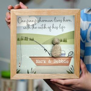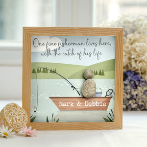 Celebrate love and leisure with our charming Fisherman and His Catch Keepsake Frame. This delightful piece features a whimsical illustration of a fishing scene, complete with a boat and serene lake backdrop. Crafted with natural stones, the artwork depicts a fisherman alongside the "catch of his life," making it a perfect tribute to cherished moments shared.