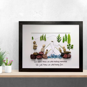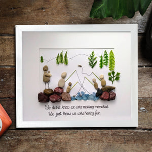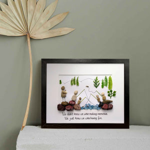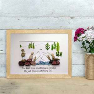 Capture the essence of cherished moments with this delightful framed artwork featuring a serene fishing scene. This unique artwork showcases playful figures made from smooth stones, joyfully engaged in an outdoor adventure, surrounded by vibrant greenery and colorful pebbles representing a serene landscape.