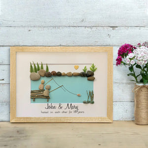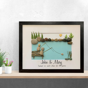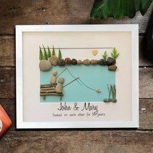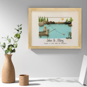 Celebrate a lifetime of love and companionship with this charming personalized frame, perfect for commemorating special milestones. This unique artwork depicts a delightful fishing scene featuring a couple, crafted from natural stones, enjoying a serene moment together by the water. The vibrant turquoise background enhances the peaceful setting, while lush greenery adds a touch of nature.