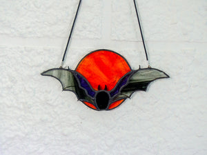Bring a touch of magic and intrigue to your home with our beautifully handcrafted Stained Glass Bat Suncatcher, an absolute must-have for Halloween Decor and Gothic Decor. This enchanting Bat Suncatcher features a striking black bat with textured dark grey and purple wings, silhouetted against a vibrant orange and red background that evokes a dramatic sunset or moonrise. It’s truly Spooky Stained Glass, crafted with care using the classic Tiffany Method, employing the Copper Foil Method and durable Solder. This Handmade Glass Art is designed to be a captivating Window Hanging, transforming any space into a realm of rich color and light. As a unique Stained Glass Window Panel, it's also a charming Stained Glass Bat Ornament, making it a piece of Unique Wall Art for your Home Decor and Room Decor. This Stained Glass Bat measures approximately 7 inches wide.
