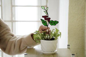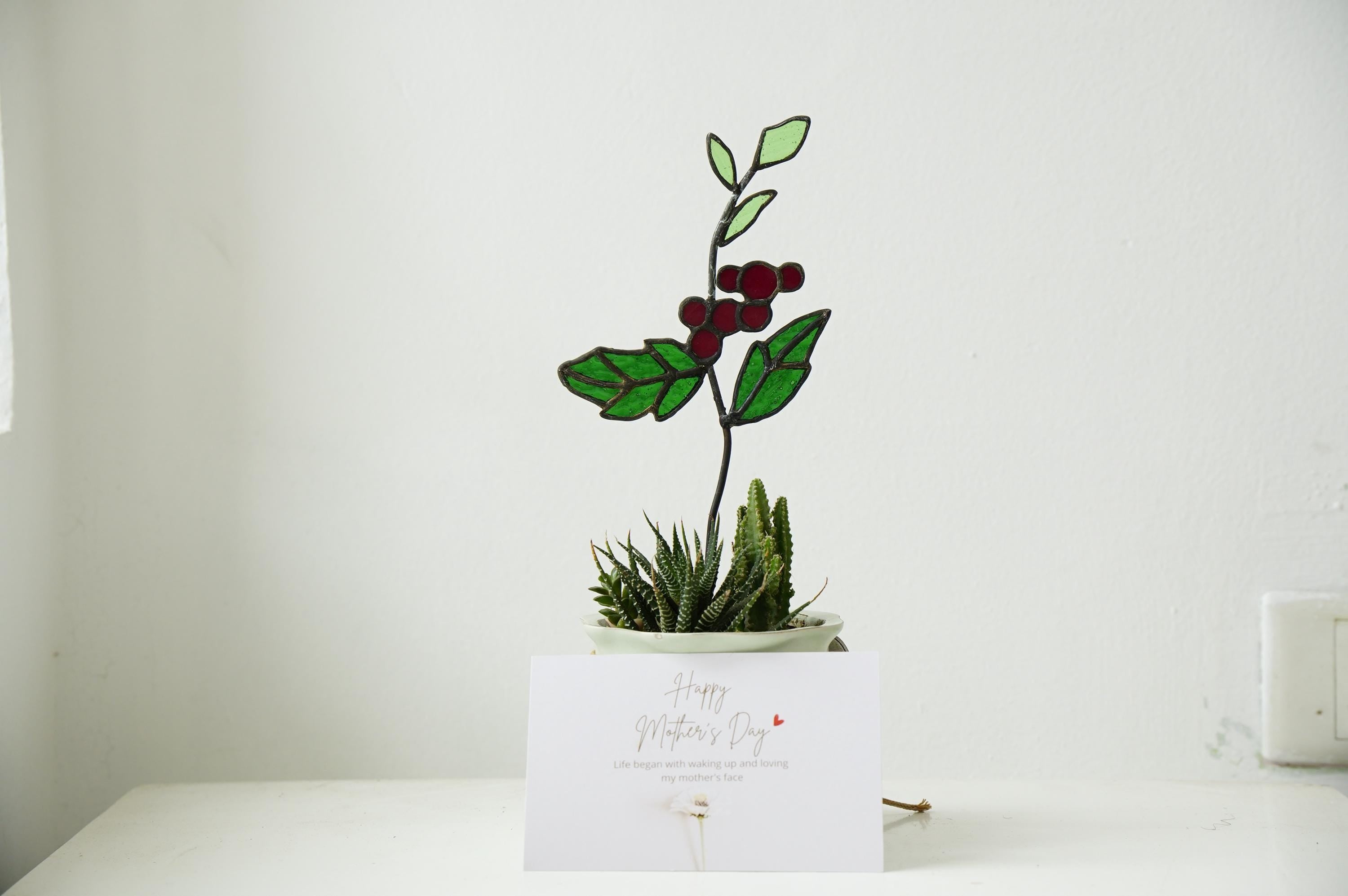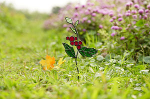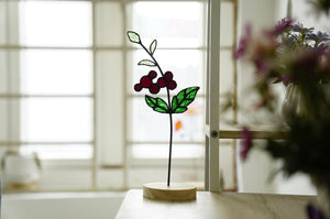 Bring a touch of vibrant nature into your space with our beautifully handcrafted `stained glass tree branch` featuring delightful ruby-red berries and lush green leaves. This stunning `fruit stained glass` piece is meticulously crafted using traditional copper foil and lead solder techniques, ensuring every detail shines with exquisite `stained glass art`. Standing approximately 25 cm (9.84 inches) tall on a sturdy wooden base, it's designed to capture the light beautifully, making it an ideal `sun catcher` or `stained glass window` accent.