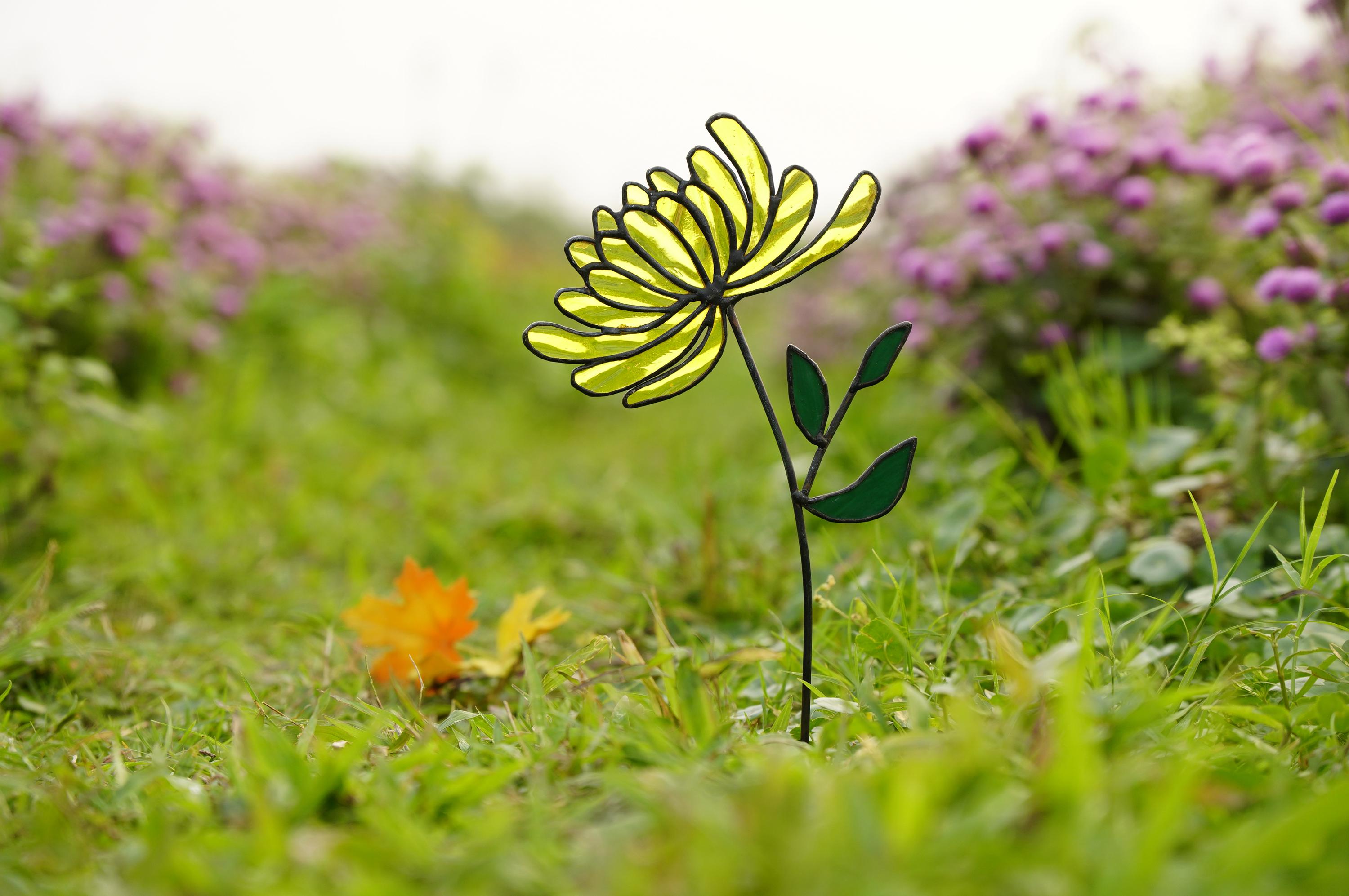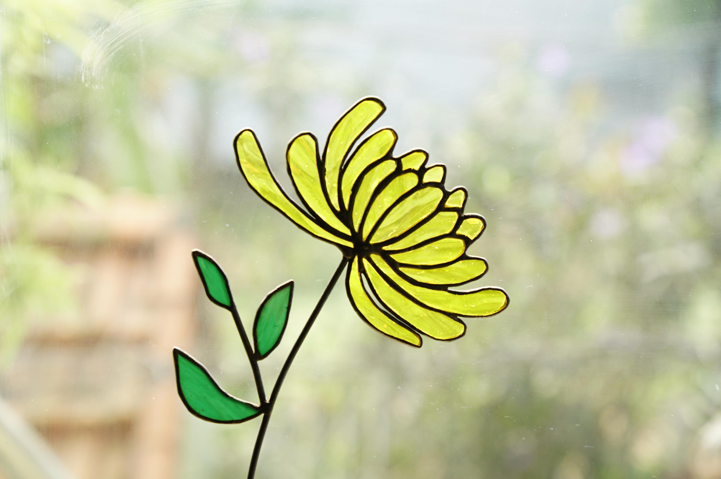 Handcrafted with meticulous care, this vibrant **Glass Chrysanthemum** features petals of brilliant yellow stained glass, expertly joined using traditional copper foil and lead solder techniques. Each detail is thoughtfully assembled, creating a durable and stunning **chrysanthemum flower** that truly shines.