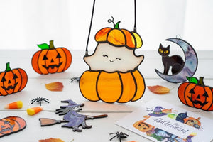 Home Stained Glass Ghost Pumpkin Suncatcher - Friendly Halloween Decor, Handmade Window Hanging, Spooky Season Gift, Tiffany Art Glass