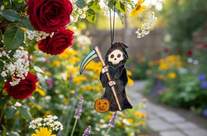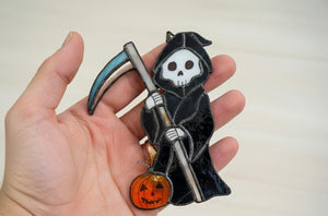 Embrace the spooky season with our captivating handcrafted stained glass Grim Reaper, ready to add a touch of gothic charm to your home. This unique piece showcases the iconic Grim Reaper in classic black and white, holding a shimmering scythe and a cheerful little jack-o'-lantern pumpkin. Each delicate glass piece is thoughtfully assembled using the traditional Tiffany Method, employing copper foil and secure solder to create a truly one-of-a-kind Art Glass creation. Standing approximately 18 cm (7 inches) tall, this striking Suncatcher is perfect for gracing sunlight-filled windows, bringing a delightful shiver to your Room Decor, or adding personality to any Wall Art collection.