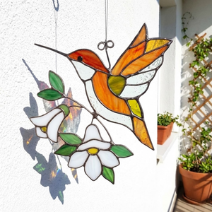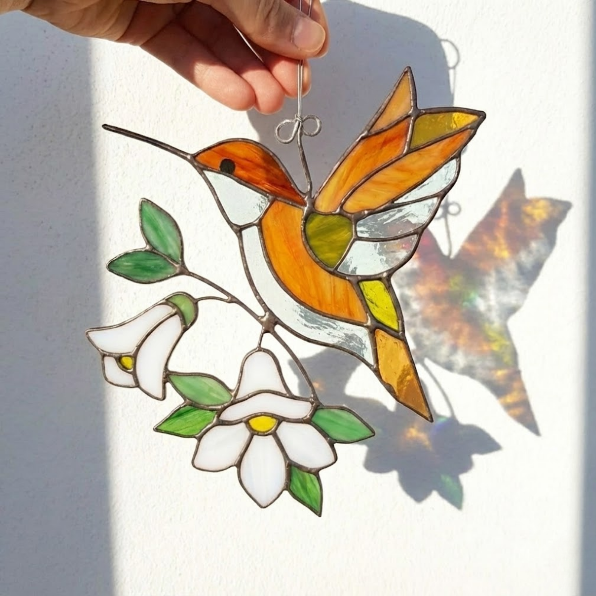 Featuring a vibrant hummingbird surrounded by delicate white flowers, this piece comes to life when sunlight passes through the glass, creating warm, joyful reflections in any space.