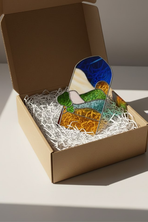 Inspired by the serenity of untouched landscapes, this design features a stylized view of rolling amber and green hills under a deep cobalt sky. Notice the unique detail where the lush green tree breaks the frame on the left side—a symbol of nature’s wild, uncontainable growth. This isn't just a decoration; it is a visual reminder to breathe, slow down, and appreciate the natural world outside our windows. It brings a healing, positive energy to any room, perfect for a meditation corner or a sunny kitchen window.