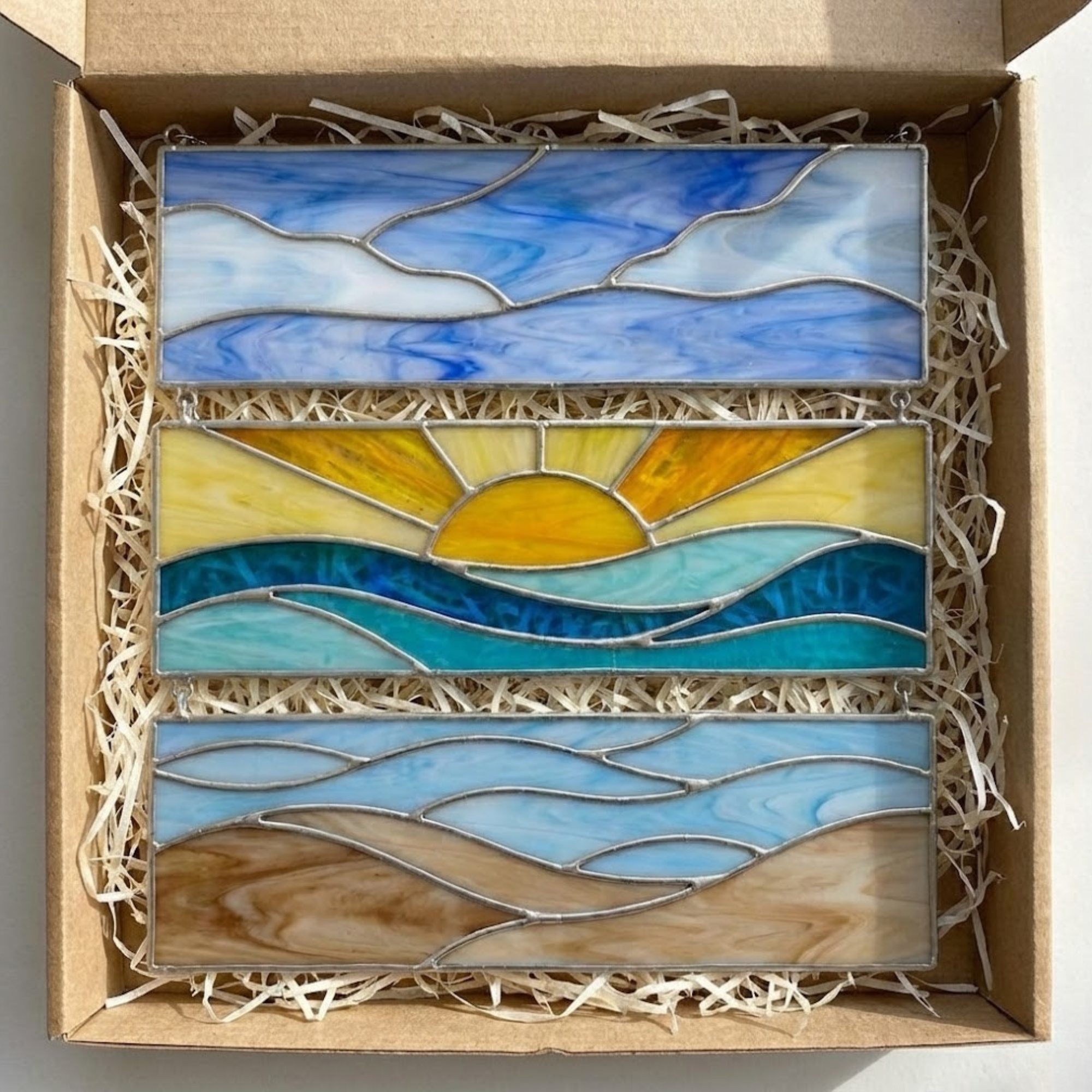 Artisan Made: Each section is meticulously hand-cut from premium stained glass sheets, chosen specifically for their unique textures—marbled whites for clouds and streaky beiges for the sand.