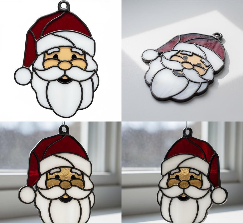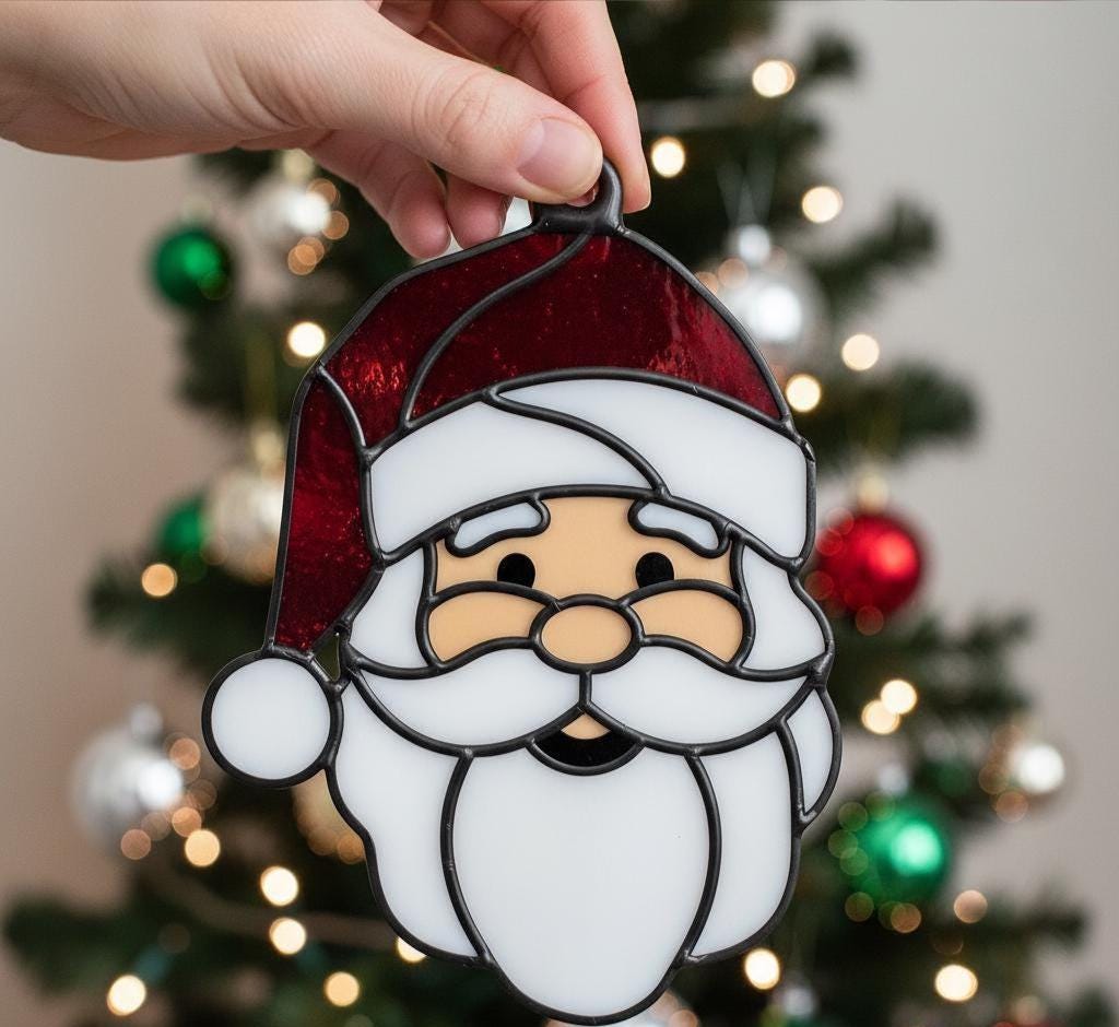 Bring the magic of the holidays home with our charming stained glass Santa ornament! This delightful stained glass ornament captures the jolly spirit of Santa Claus ornament perfectly, with his iconic red hat, flowing white beard, and warm smile. Each glass santa head is a true artisan made ornament, meticulously crafted from vibrant stained glass pieces, reminiscent of a delicate glass mosaic ornament, and thoughtfully assembled using traditional copper foil and lead solder techniques, creating a beautiful leaded glass art piece that feels like a treasured craftsman ornament.