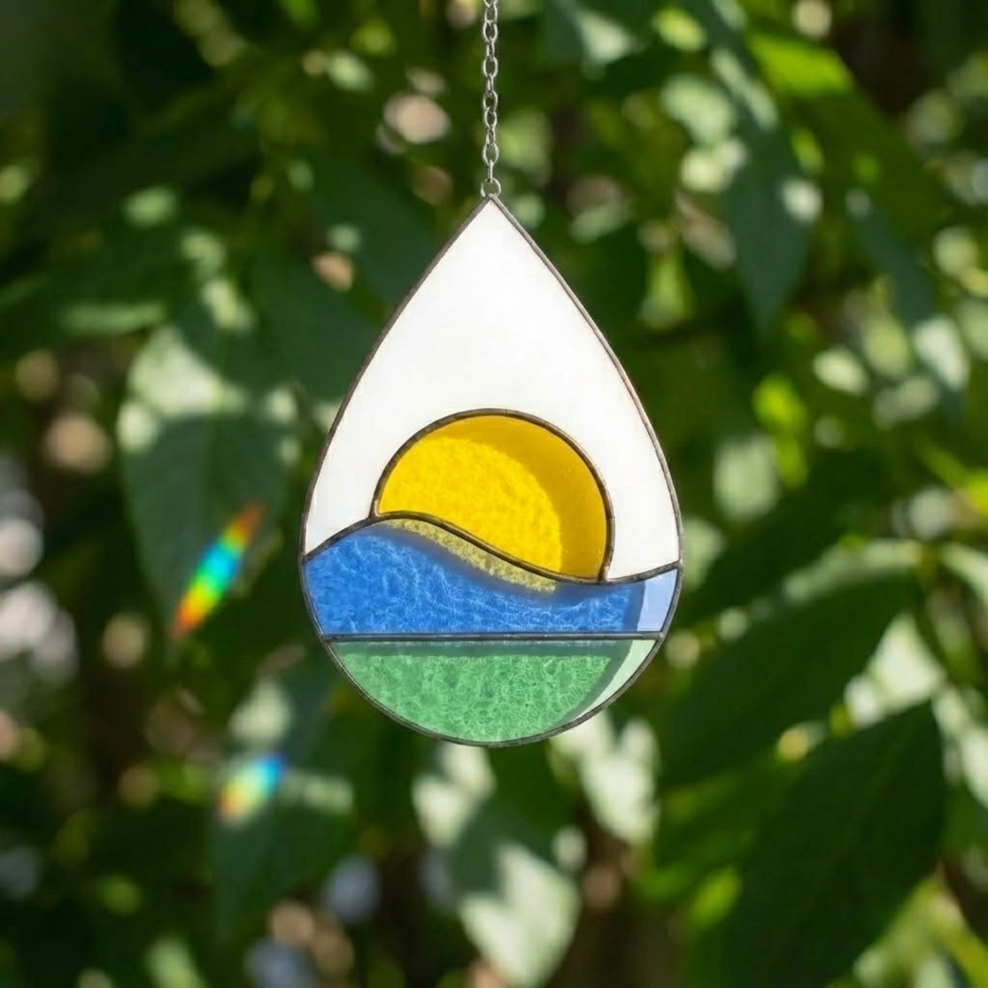 🌄 Story & Meaning: The "Morning Drop" Inspired by the reflection of the world in a single drop of morning dew, this design captures a minimalist landscape within a classic teardrop shape. The bright yellow sun rising over textured blue waters and rolling green fields symbolizes hope, renewal, and vitality. It makes a thoughtful gift for anyone going through a life transition or simply for someone who finds their peace in the great outdoors.